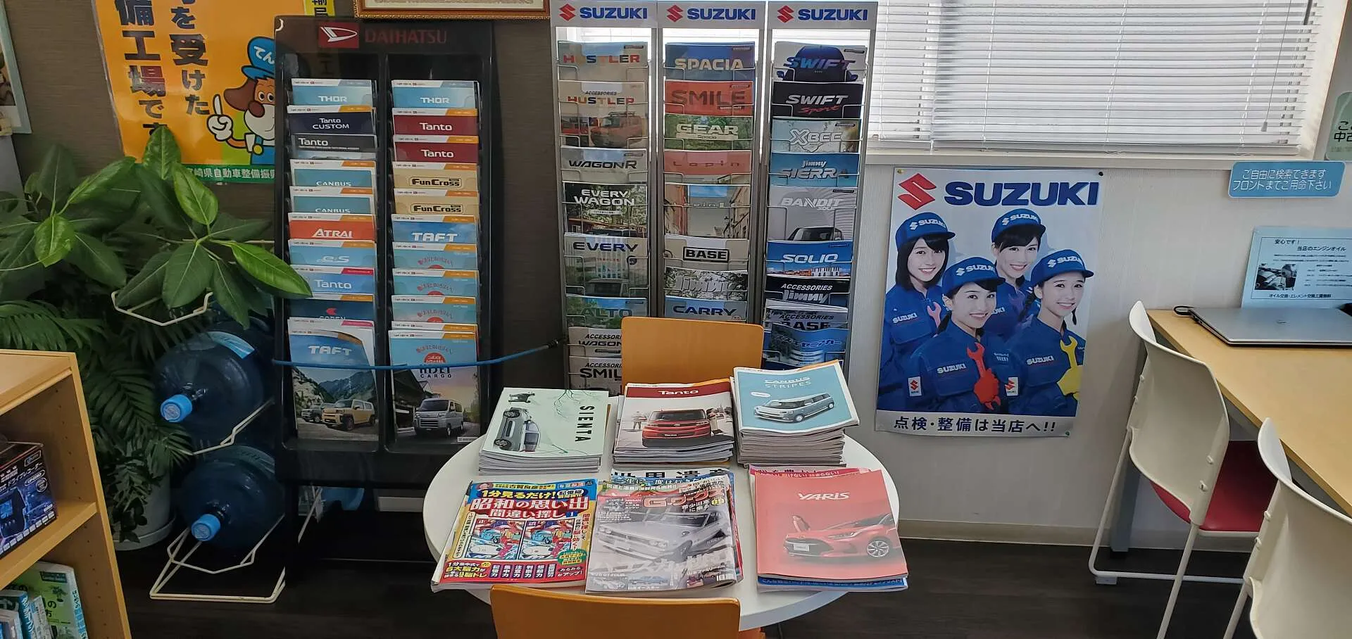 店頭には販売しているカタログがございます。乗りたいお車が決まっていなくても、ぜひ冊子を手に取ってご覧ください。在庫の無いカタログは、事前に取り揃えますのでお申し付けください。
